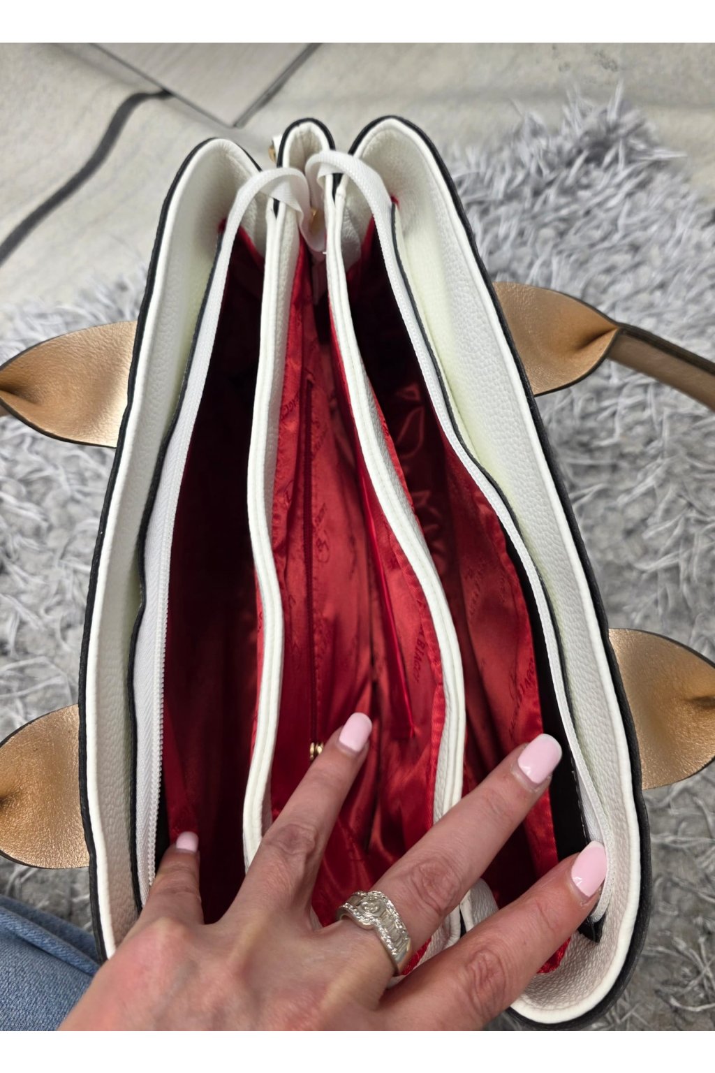 - kabelka má zapínání na zip, uvnitř 3 samostatné kapsy + dvě kapsy na drobnosti